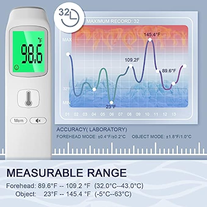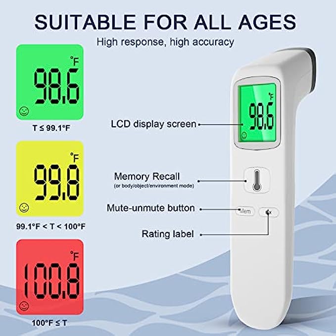 Memory Storage & Auto Fever Alarm: The Forehead thermometer can save 35 sets of temperature readings. You can easily track the historical temperature changes. Its LCD screen has 3 different colors(green/yellow/red) according to different temperature levels. The abnormal temperature(red screen) will be accompanied by a warning sound.