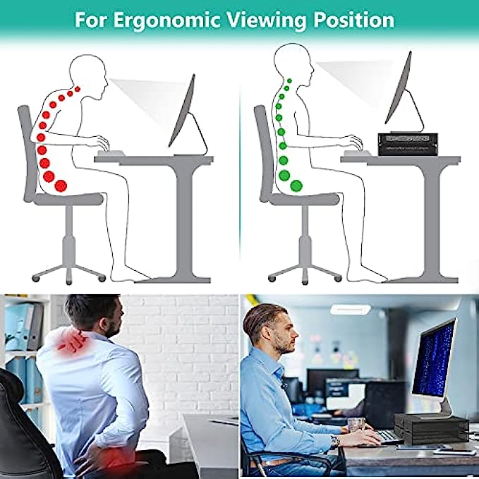 • Ergonomic: Raise TV, monitor or laptop by 4.7 inches off the desktop to create a comfortable viewing position and a better healthy sitting position which help reduce stress on the neck and back.